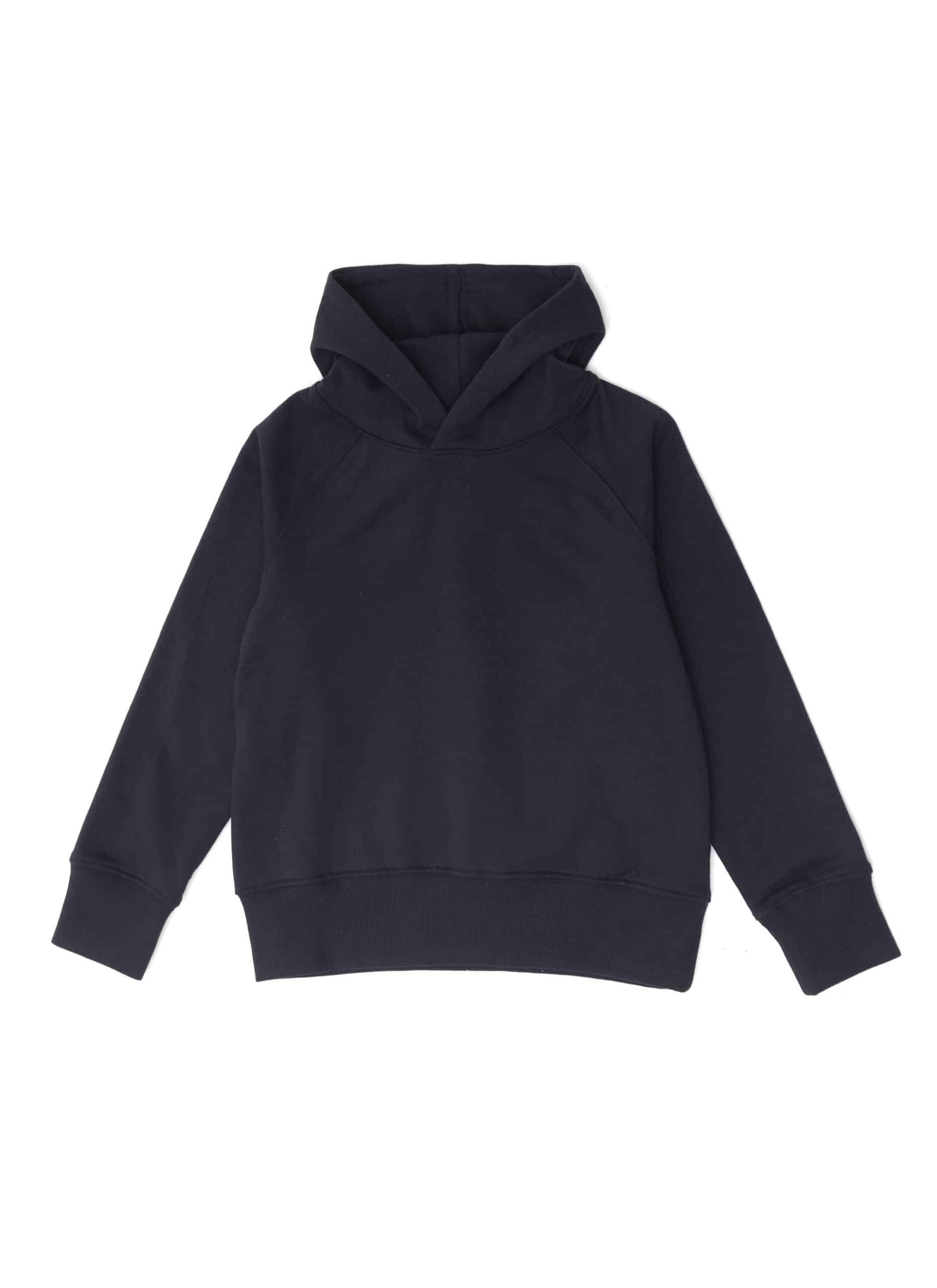 This no-stress hoodie delights kids with its soft material and relaxed design. Our go-to hoodie is made from recycled cotton and recycled plastic bottles. The inside is soft, brushed knitted fabric. The hoodie has comfortable raglan sleeves and a straight cut. The generously sized hood has drawstrings, which are made from excess knitting machine yarns to reduce waste. The hem and sleeve openings are ribbed. Suitable for both girls and boys.